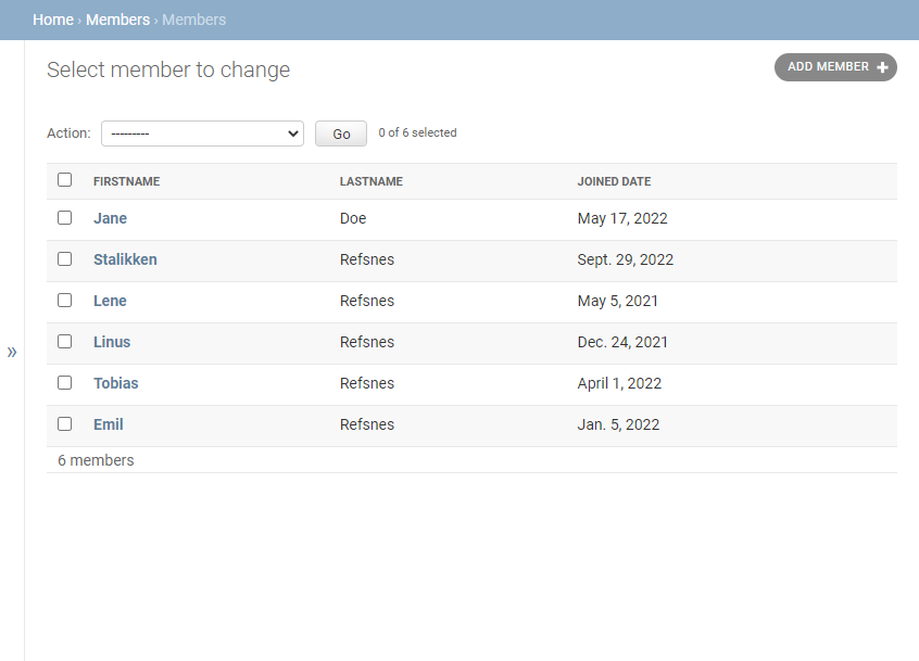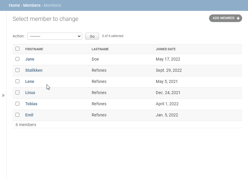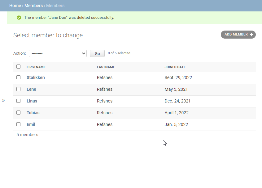 To delete a new member, you can either select a member and choose the action "Delete selected members" like this: