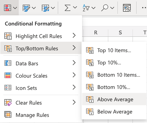 Above and Below Average Rules are found in the Top/Bottom Rules part of the conditional formatting menu: