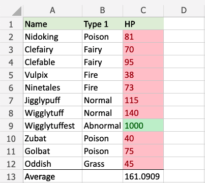 Now, the cells with above average HP values (more than 77.2) will be highlighted in green: