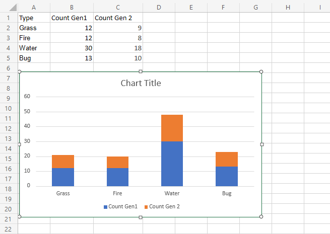 The chart gives a visual overview for the total number of "Grass", "Fire", "Water" and "Bug" type Pokemons in both generation 1 and 2.