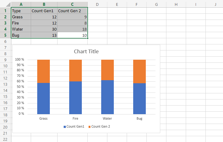 The chart gives a visual overview for the proportion of "Grass", "Fire", "Water" and "Bug" type Pokemons in both generation 1 and 2.