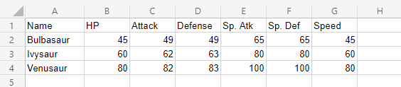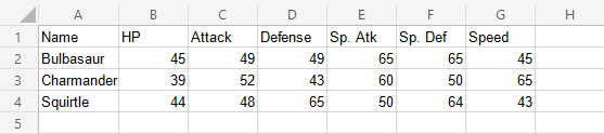 Let's compare the stats for Bulbasaur, Charmander and Squirtle.