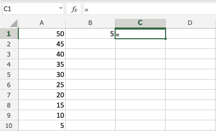 Goob job! You have successfully used absolute reference to divide B1(5) with the range A1:A10.