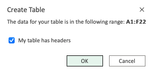 Note: The range (A1:F22) already has headers in row 1. Unchecking the "My table has headers" option allows you to create a dedicated header if you do not already have it.
