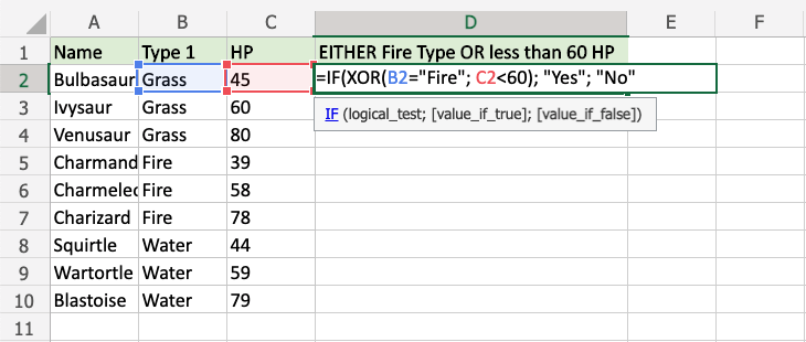Example XOR function as the condition for IF function, step by step: