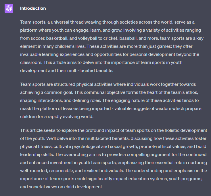 For an article about "The importance of team sports for youth development", write a section about "Introduction - including information about team sports and the purpose of the article":