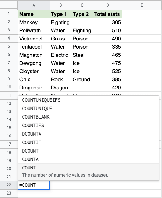 Apply the =COUNT function to range D2:D21. Counting the cells of Pokemon Total stats, which is numbers only: