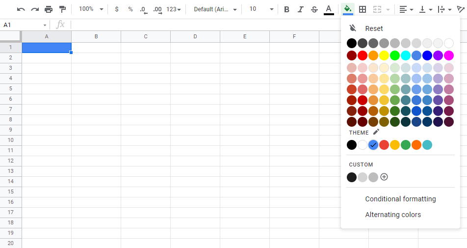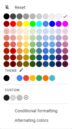 Google Sheets has a set of standard, theme and custom colors available for use. You select a color by clicking on it: