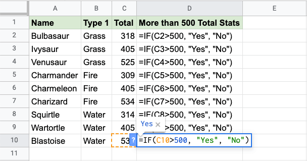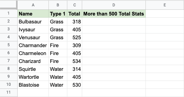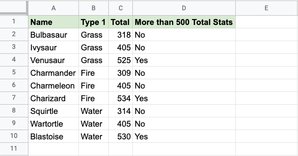 Now, each row has a check for having more than 500 total stats: