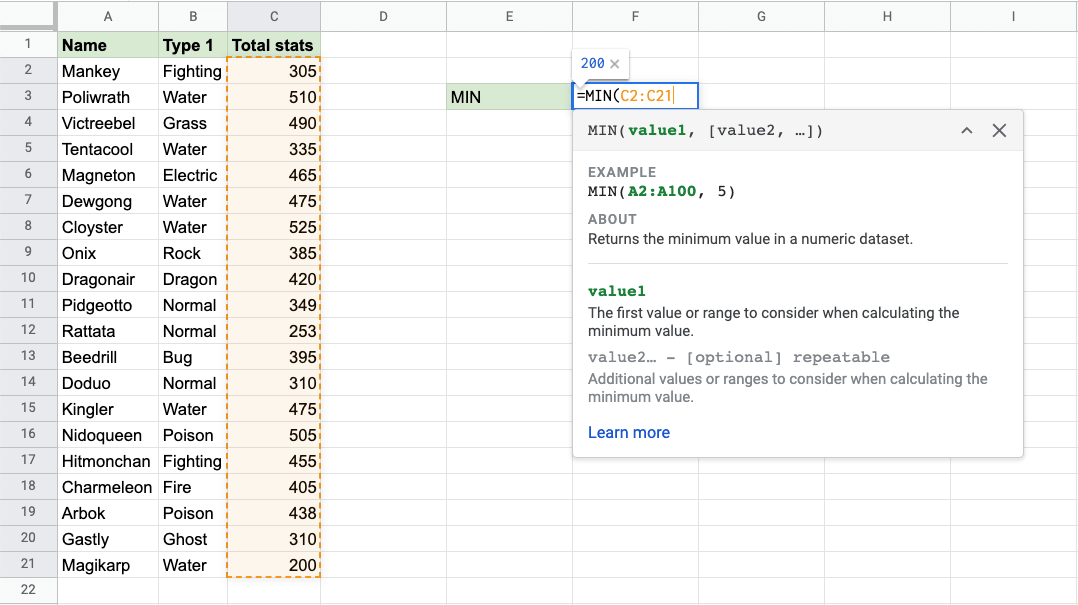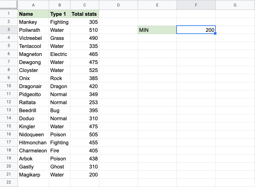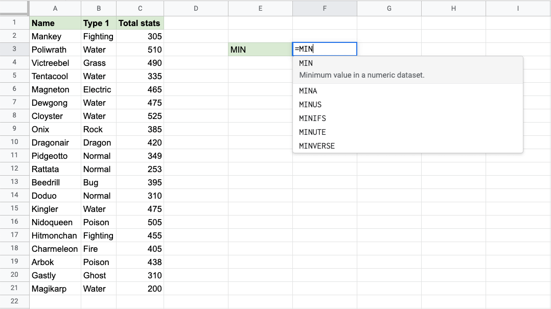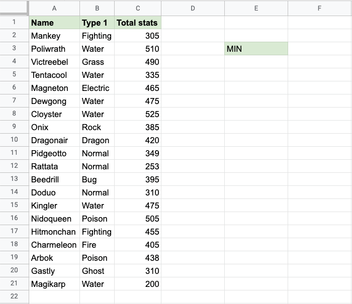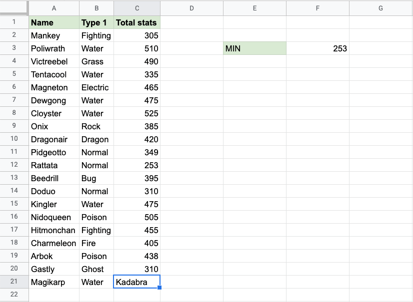 Right on! The function ignores the text typed in the range. 253 is returned as the new lowest value, as the old one was replaced with text. Rattata is now the Pokemon with the lowest Total stats in the range C2:C21.
