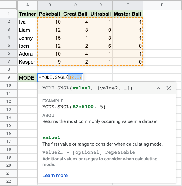 The MODE.SNGL function, step by step: