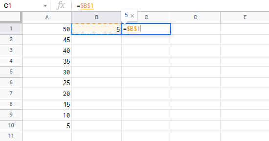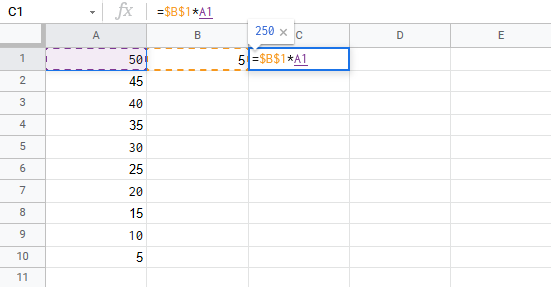 You got it! You have successfully used absolute reference to multiply B1(5) with the range A1:A10.