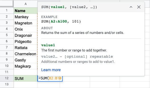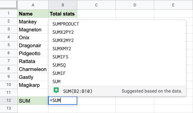 The SUM function is a premade function in Google Sheets, which adds up numbers in a range.