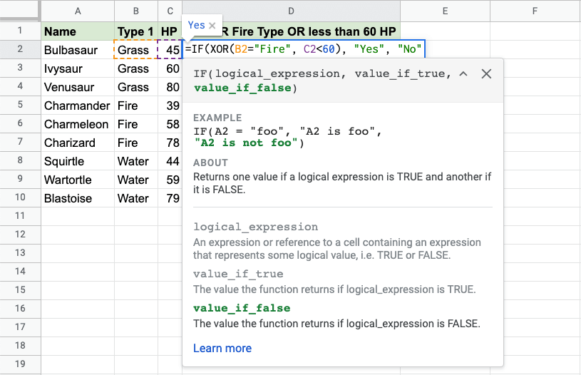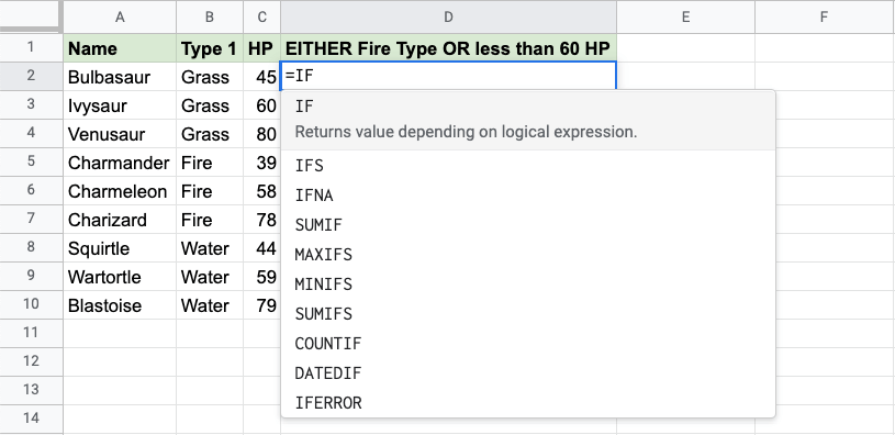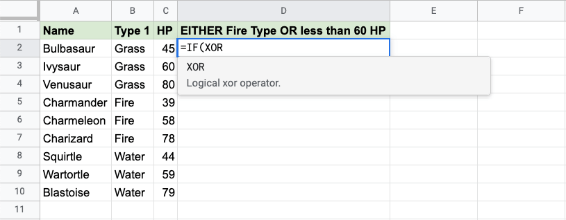 Now, each row has a check for Fire Type or HP less than 60, but not both:
