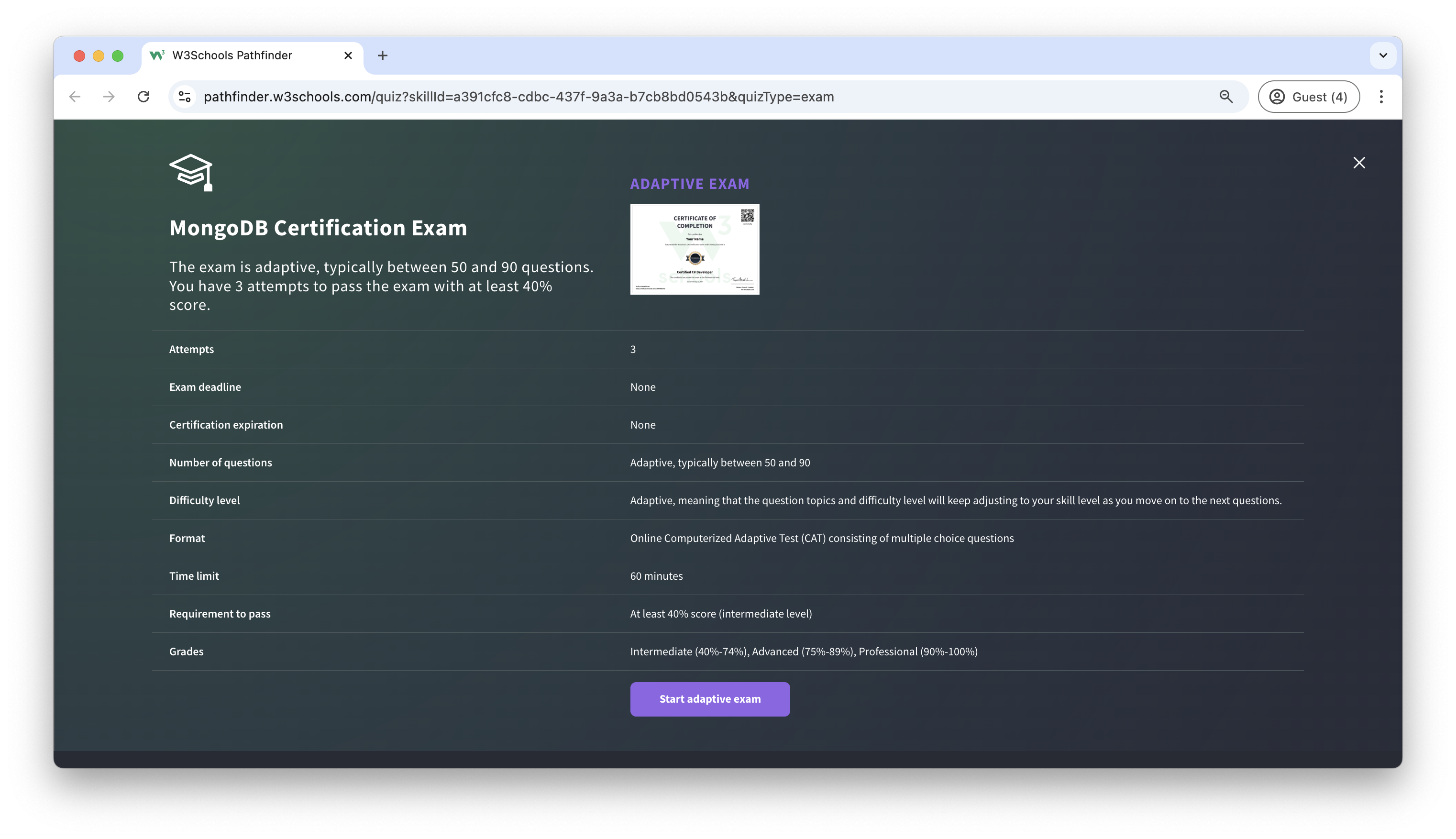 The MongoDB exam is a test that summarizes the W3Schools MongoDB syllabus.