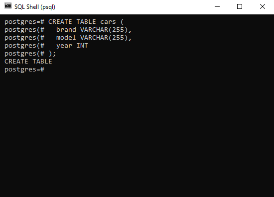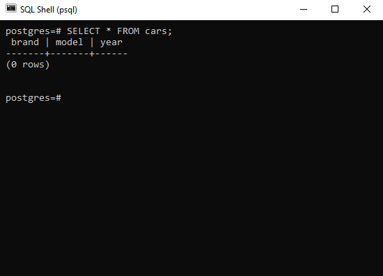 When you execute the above statement, an empty table named cars will be created, and the SQL Shell application will return the following: