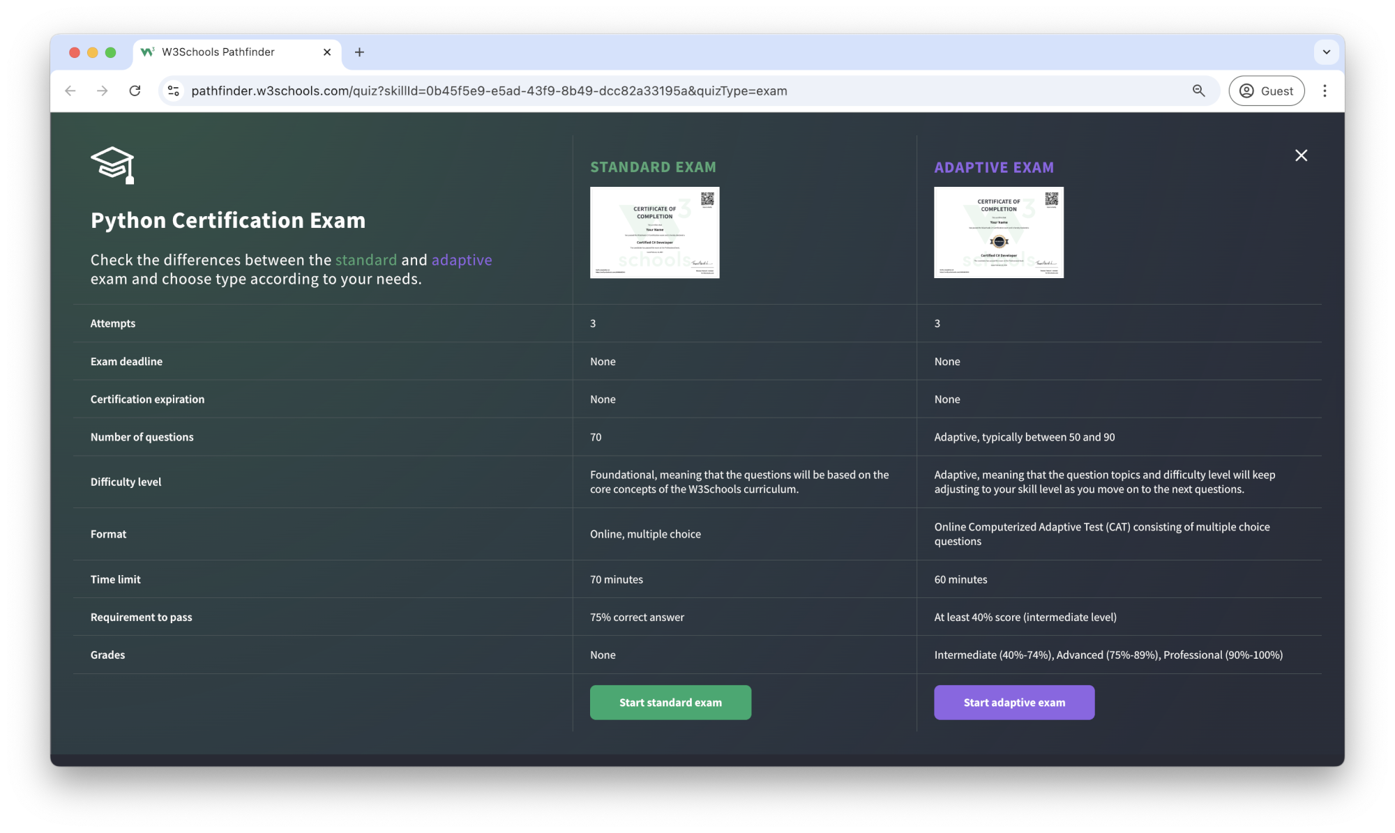 The adaptive certification is adaptive and graded; students will get a grade from intermediate, advanced to professional.