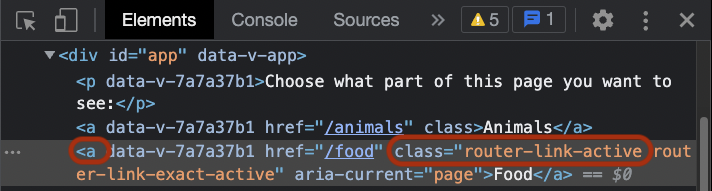 The <router-link> component is rendered to an <a> tag. We can see that if we right-click the element in the browser and inspect it: